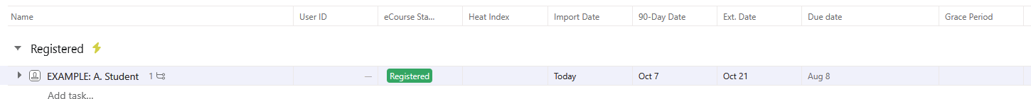 - The Due Date, is set for 30 days from when you created the task/student in Asana so you can be reminded to check on your student at or before the 30-day mark to motivate them into starting the eCourse
