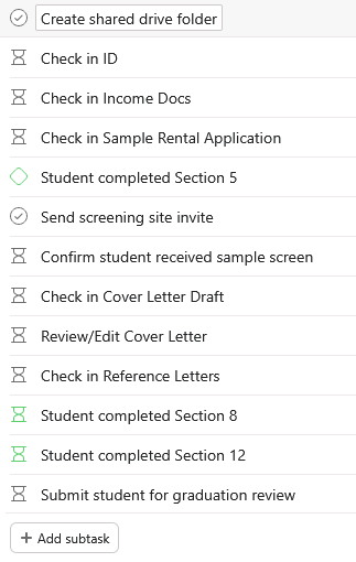 You will see that some of the new sub-tasks for the student have dependencies, meaning that you can't complete that subtask until other subtasks are completed first. For example, in order to check in any Housing Portfolio Documents, you need to create a folder on the shared drive first.